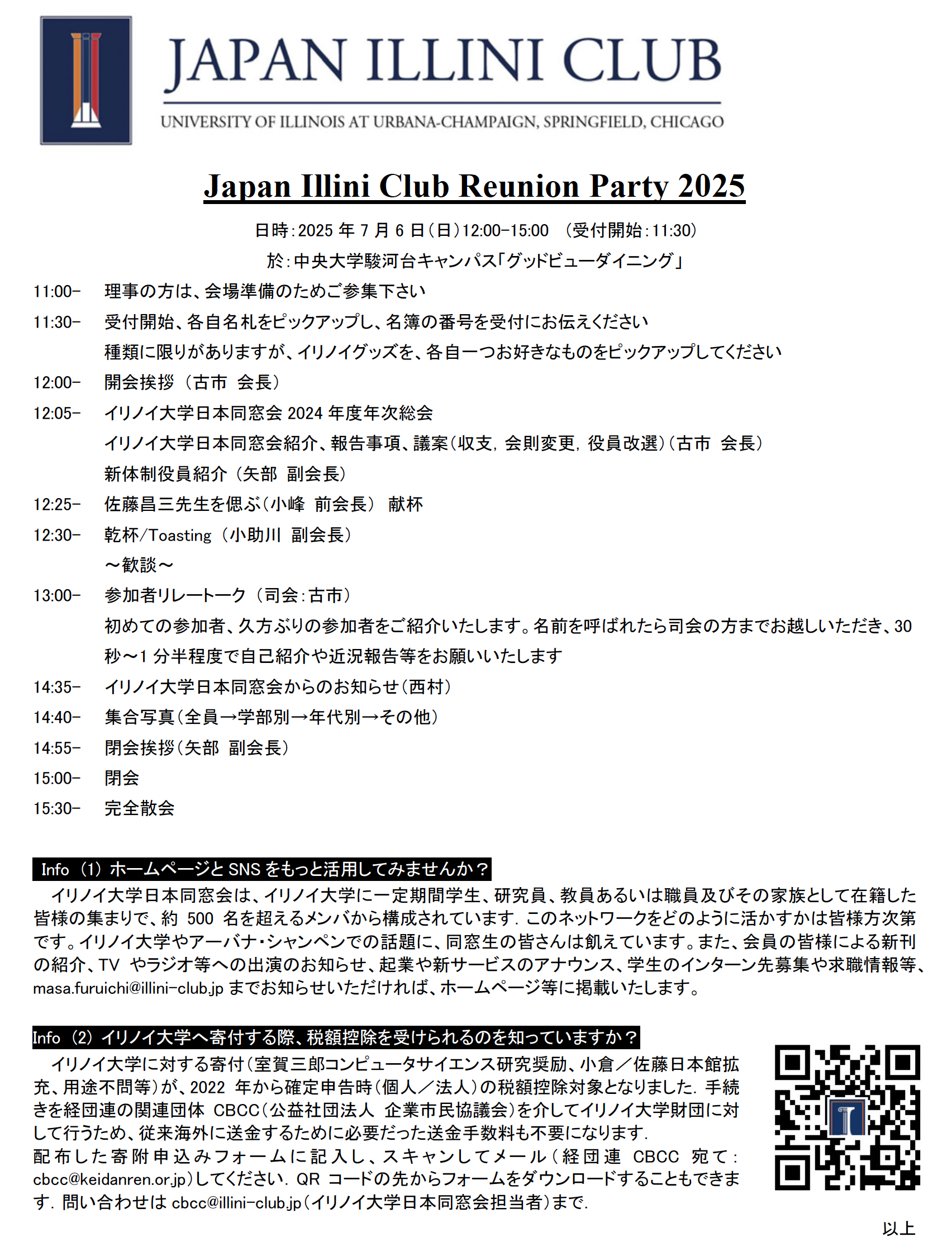 イリノイ大学日本同窓会とイリノイ大学基金(英文名 University of Illinois Fundation)では,公益社団法人 企業市民協議会(英文名 Council for Better Corporate Citizenship (CBCC),経団連の呼びかけにより1989年9月に設立された公益社団法人)と協定を締結し,イリノイ大学に対する寄付について税額控除することが可能となりました. 経団連CBCCのサイト「第46回承認プロジェクト:2021年5月承認」部分に,その他承認プログラムと一緒に一覧が掲載されています.